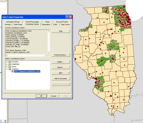(The projection “tilts” the state of Illinois to the left, but I can re-orient the state before I layout my map by re-assigning an equal area projection to the data frame.)