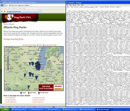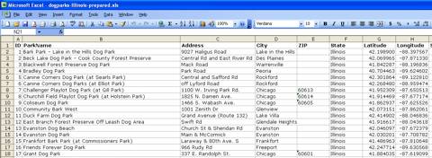 For all 51 Illinois dog parks, I copy and paste seven separate text strings (name, city, longitude, latitude, etc.) into an Excel file, making sure that each piece of data is in its own column.