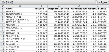 The table below describes how I will operationalize each of these preferences. Included are data sources, weights (on a scale of 1 to 10), and data preparation notes. I give the highest weight to dog parks because they offer greater socialization opportunities for dogs than human parks. Giving parks higher weights is based on the assumption that outdoor recreation, exercise and socialization are daily needs regardless of income or distance from known abusers.