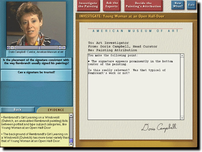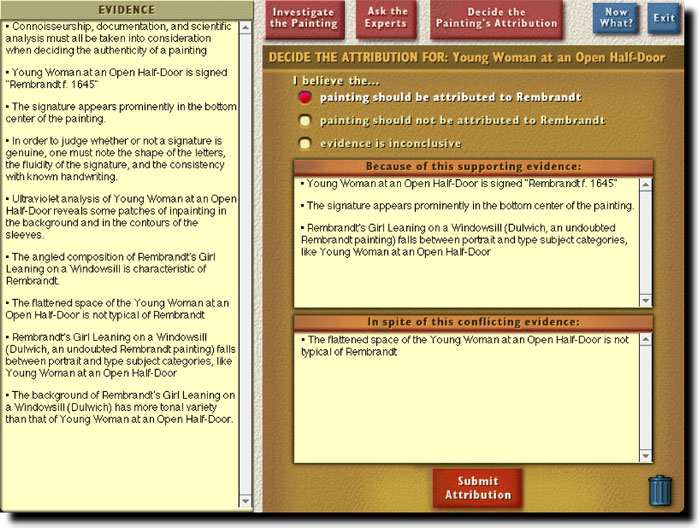 The "Is it a Rembrandt?" program, built in collaboration with Professor Larry Silver, formerly of Northwestern University's Art History Department, introduces art history students to these issues by having the student determine the authenticity of three Rembrandtesque paintings. By inspecting the painting, running laboratory tests, and asking art experts questions (via a video archive of over 450 clips), students gather evidence that they later use to argue for an attribution. Throughout this process students encounter the complex issues surrounding connoisseurship and attribution, and learn more about both painting in general and Rembrandt in particular.